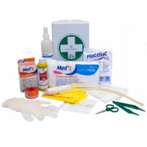 Contiene 1 flacone ml.125 di disinfettante iodopovidone; 1 flacone ml.250 di soluzione fisiologica; 2 paia di guanti sterili; 1 busta di garza sterile cm.18x40; 3 buste da 2 compresse di garza sterile cm.10x10; 1 pinzetta da medicazione sterile monouso; 1 confezione di cotone idrofilo da 50 g.; 1 benda orlata mt.5x10 cm.; 1 astuccio da 20 cerotti assortiti; 1 rocchetto di cerotto in tela mt.5x2,5 cm.; 1 paio di forbici; 1 laccio emostatico; 1 confezione di ghiaccio secco; 1 sacchetto portarifiuti; 1 manuale di istruzioni DM 338.